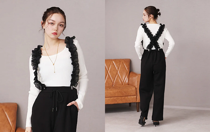 存在感のあるチュールフリルが、クローゼットに眠っているシンプルなTシャツやリブニットを、一瞬で「鮮度の高いモードな装い」へと引き上げます。