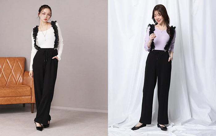 すとんと落ちるシルエットとの相乗効果で、スッキリとした美脚シルエットを叶えました。