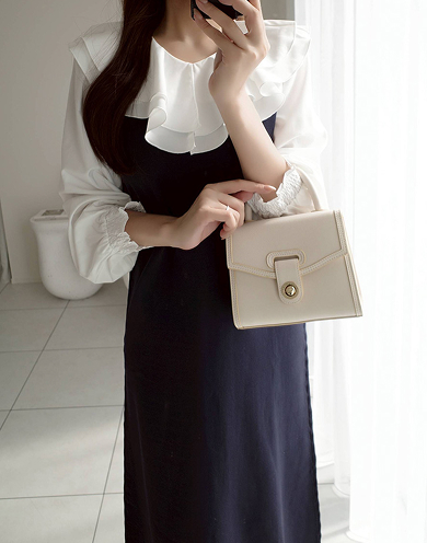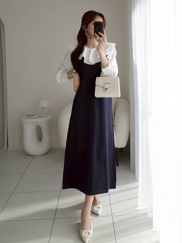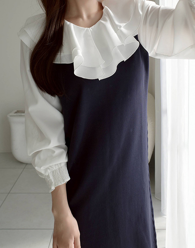 【cho____07セレクト】 衿元フリル異素材ドッキングワンピース