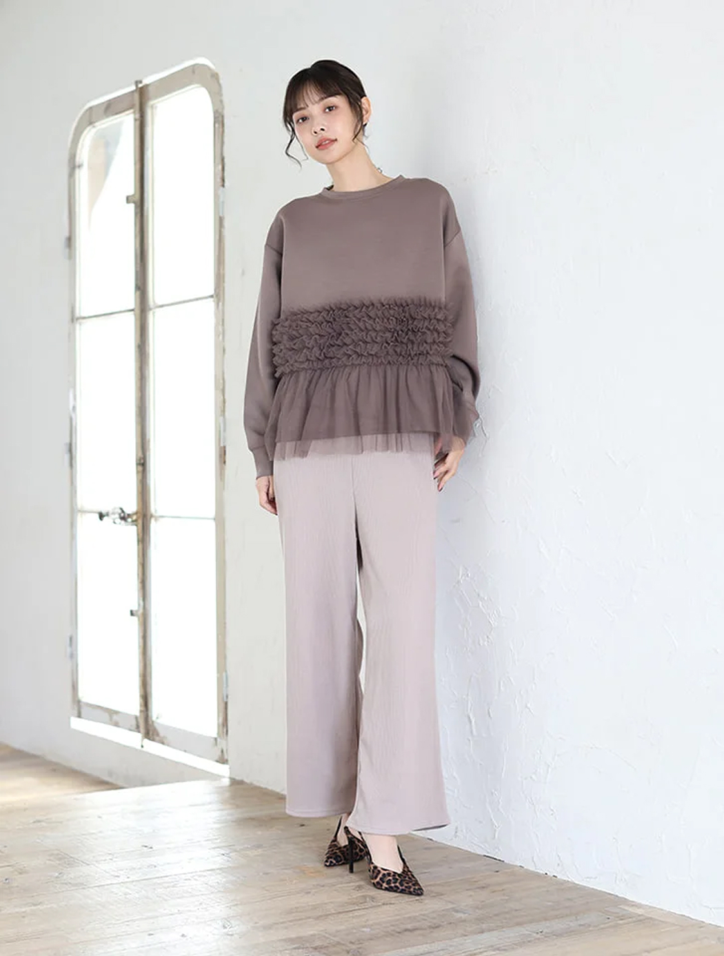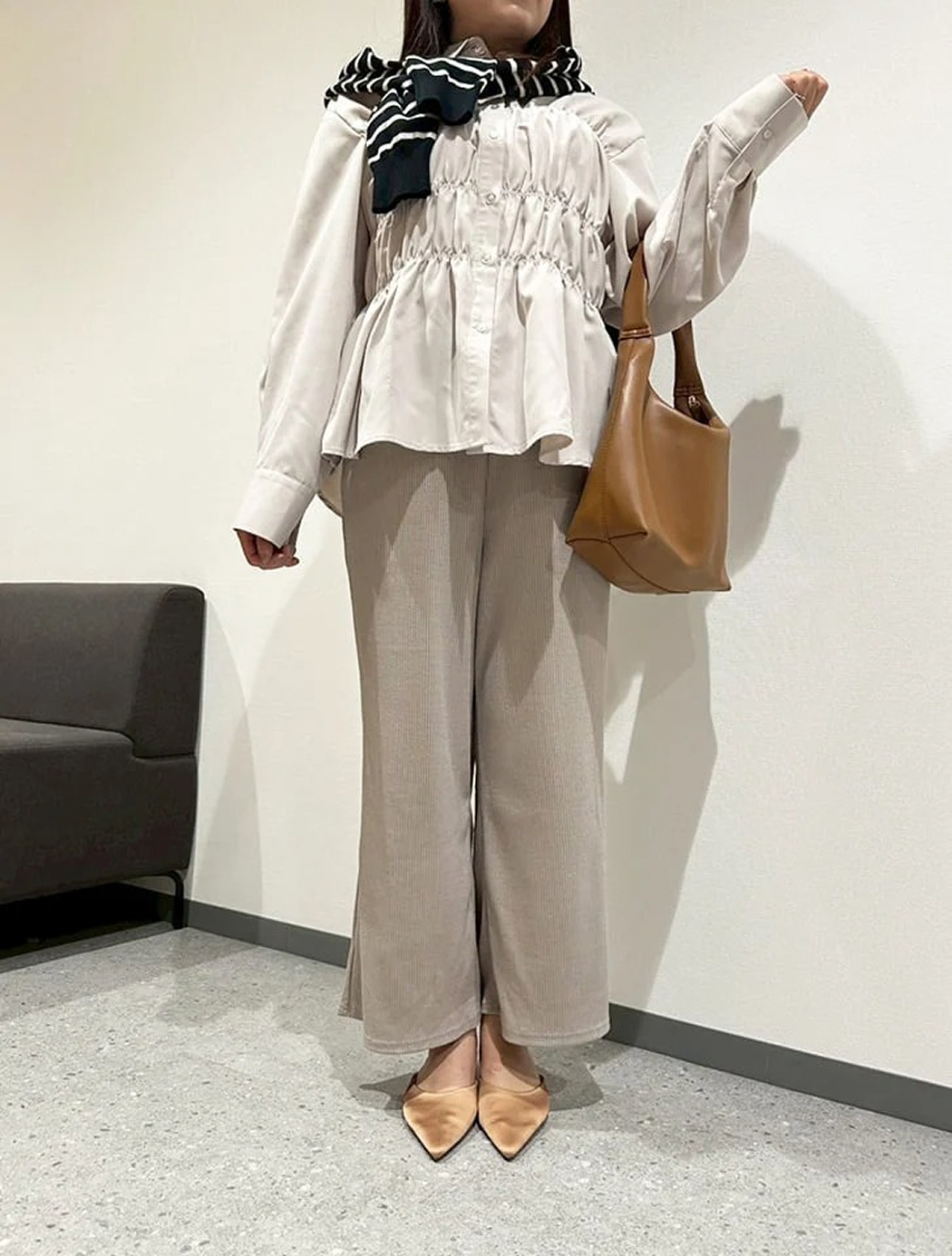 「異素材と上品ミックス」を意識リブパンツの最大の魅力は、ノーストレスなリラックス感です。しかし、合わせるアイテムを間違えると、せっかくのオシャレも部屋着感が出てしまいます。洗練された大人カジュアルに格上げするカギは、「異素材」と「上品さ」の意識的なミックスがおすすめ。